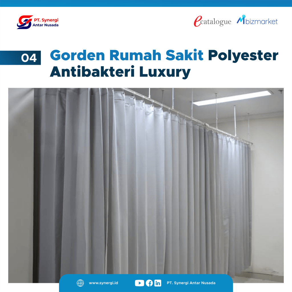Gorden rumah sakit Polyester Antibakteri Luxury dilengkapi dengan treatment anti bakteri, anti air, anti darah, dan anti jamur sehingga sangat cocok digunakan pada Rumah Sakit maupun Hotel, terutama pada ruangan kelas 1, VIP, VVIP. Jenis gorden ini dapat dicuci hingga 60 kali sehingga menjadikan gorden tetap bersih dan higienis.
